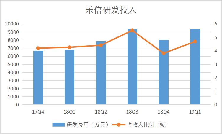 把时间拉的更长一点,最近6个季度(17Q4-19Q1),可以发现乐信在研发投入其实是持续性的,并保持在较高水准,乐信平均每个季度研发费用占当季总收入比例大约5%左右,乐信研发投入,并非此一时彼一时头脑发热之举,而是战略性投入。