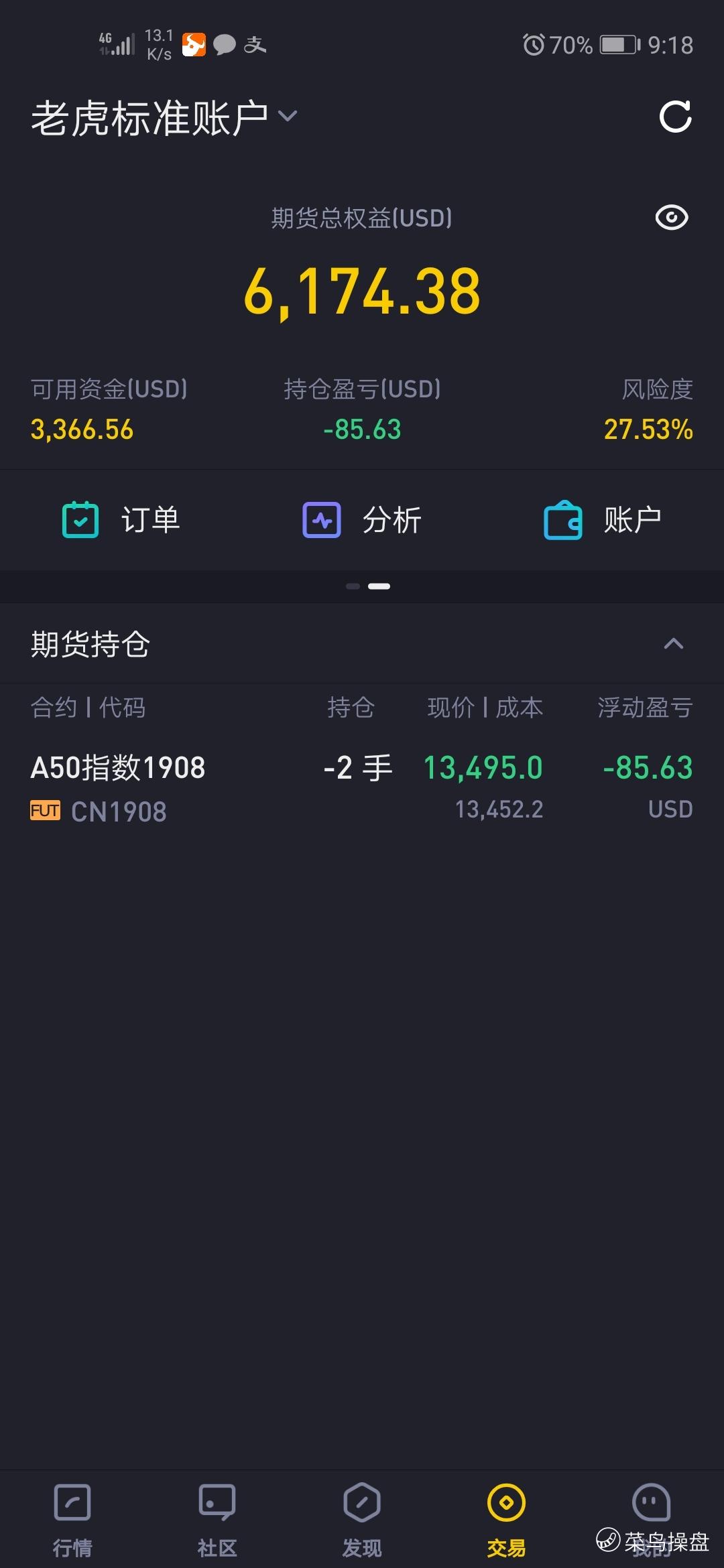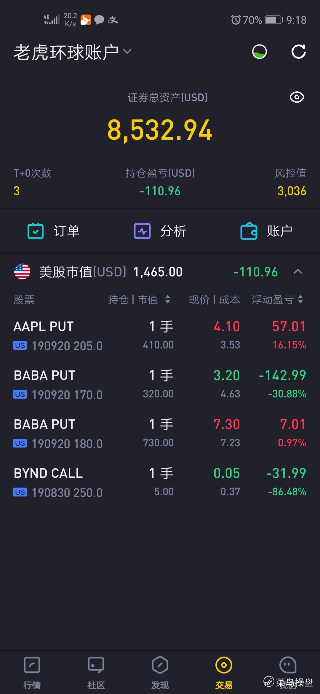 今日苹果先涨后跌,后收平;阿里巴巴小幅上涨;认为没有什么行情。A股交易时间加仓A50空单。近期特朗普不发左右股市的推特,不应该啊。无行情就尽量空仓。$Beyond Meat, Inc.(BYND)$ $微软(MSFT)$ $A50指数1908(CN1908)$ $阿里巴巴(BABA)$ $万达体育(WSG)$ $苹果(AAPL)$ $特斯拉(TSLA)$ $A50指数1909(CN1909)$ $京东(JD)$