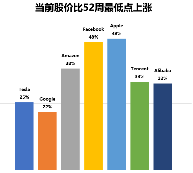 反过来我们看一下当前股价比52周最低点上涨情况,其中苹果、Facebook、亚马逊均超过了33%的一级逃顶门槛,理论上都应该卖出一个资金单位的股票。