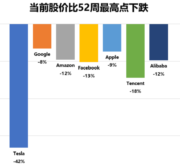 首先看当前股价比52周最高点下跌的情况。目前除了特斯拉以外下跌都不超过25%。而特斯拉之前已经跌破过50%,所以按照分级抄底策略已经进行了3轮的抄底。