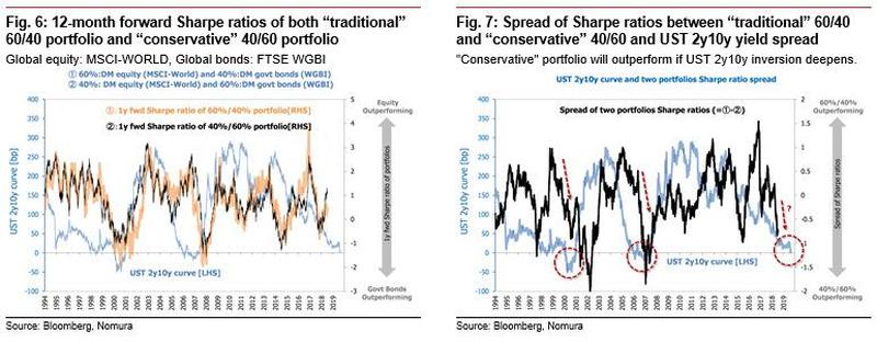 Takada指出,很多标准的60%股票和40%债券的投资组合可能会转变成更为保守的40%股票加60%债券。在债券收益率曲线倒挂的时候,后一个投资组合的表现确实往往更好。