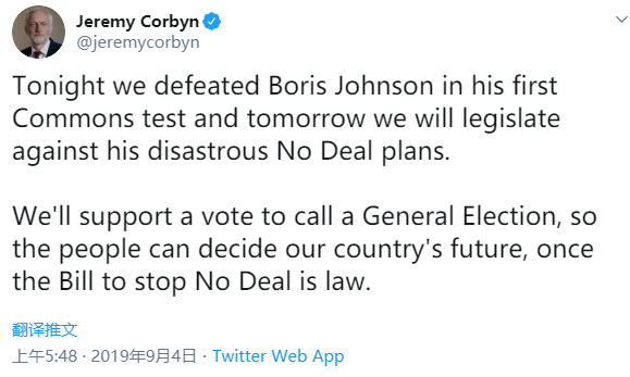 (科尔宾:今天我们阻止了约翰逊具有破坏性的无协议脱欧计划,后续只要反对无协议脱欧的议案获得通过,工党就会支持提前大选,来源:推特)
