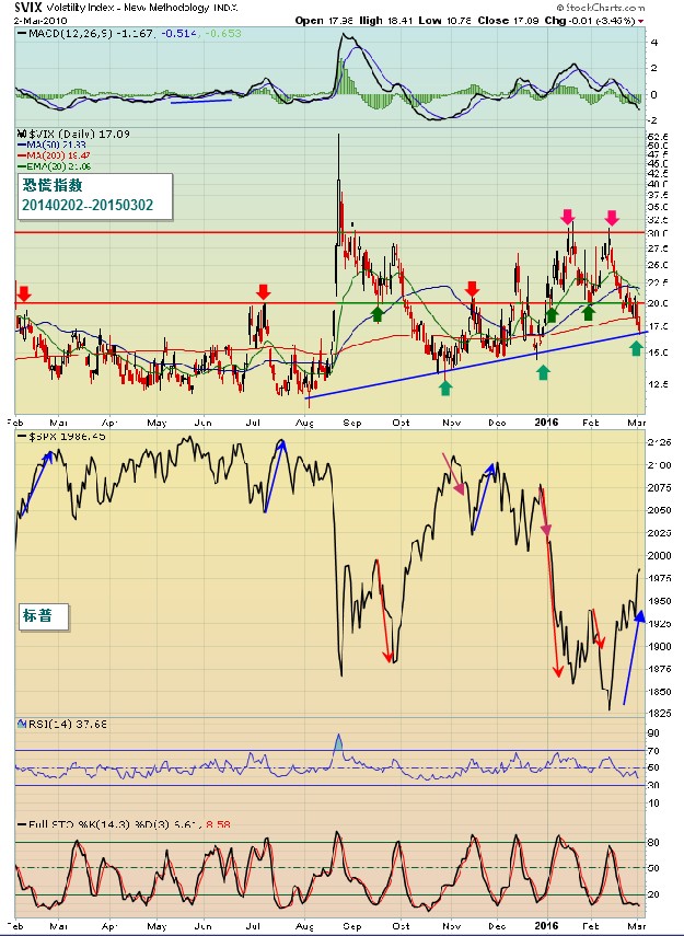 从历史走势看,恐慌指数和标普呈现出一定的负相关性。这里截取2015年2月到今天的走势。