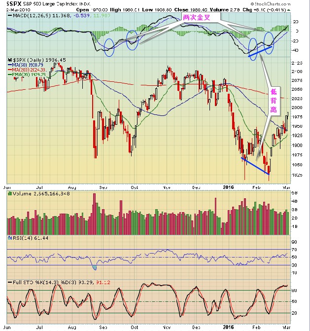 如图,在2.11本轮反弹启动前,标普日线上出现了一个明确的MACD底背离态势,因此一定程度上,反弹的延续性要好于一月底的那一次。