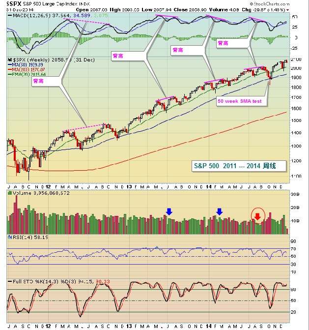 这里我们截取标普2011年到2014年期间的周线走势,更直观的说明大盘在周线级别MACD顶背离态势之时的走势特点。如下图: