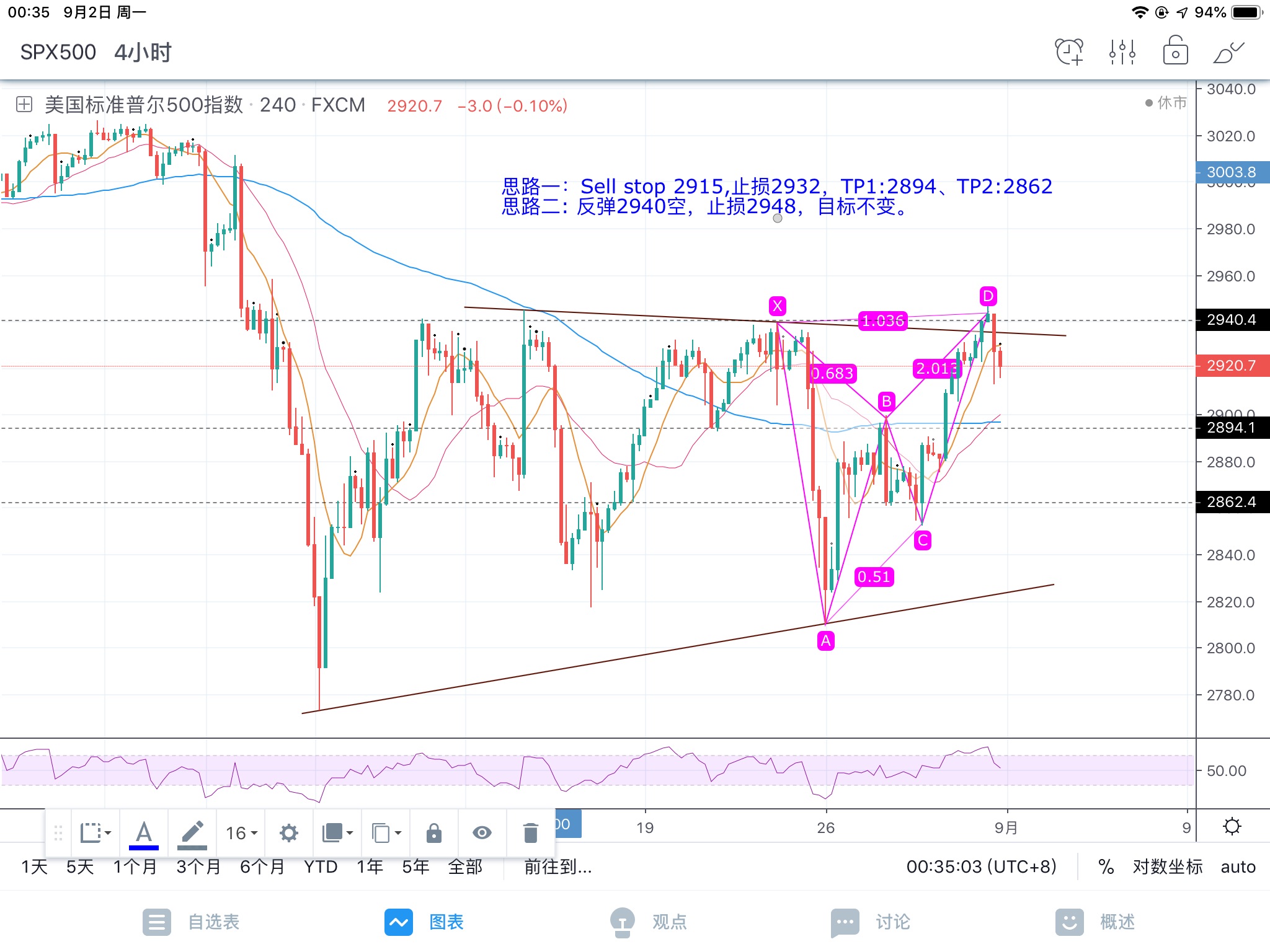 思路一:Sell stop 2915,止损2932,TP1:2894、TP2:2862