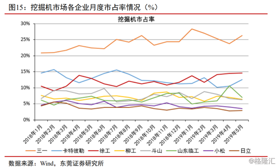 2019年1-5月,三一市占率达25.6%,稳居第一;徐工市占率达13.8%,位居第二;山东临工市占率7.1%,攀升至第五位。卡特彼勒、斗山、小松市占率分别达11.2%、7.4%、4.0%,分别较2018年下降1.8、0.5、1.0个百分点。