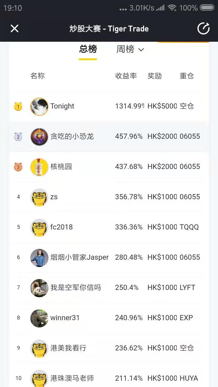 3,大赛为了提高参赛者的积极性还设立了奖品奖金[财迷],这个我就不多说了,大家都可以看得到,但是还是感谢老虎自掏腰包帮助投资者练习,这点很良心[强]虽然我不看重奖品[得意](主要是我的实力拿不到[无语])更看重学习体验,希望日后可以跟各位获奖选手 交流学习,截止发帖时间该选手 @Tonight 依然是榜首,收益高达1314.99%