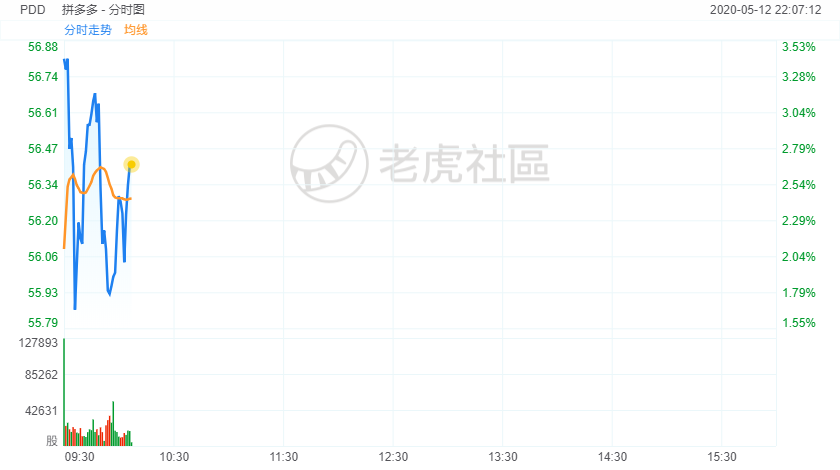 5月12日美股盘中,拼多多一度上涨至57.12美元,创历史新高。截止北京时间21:53,该公司涨2.22%,报56.16美元。