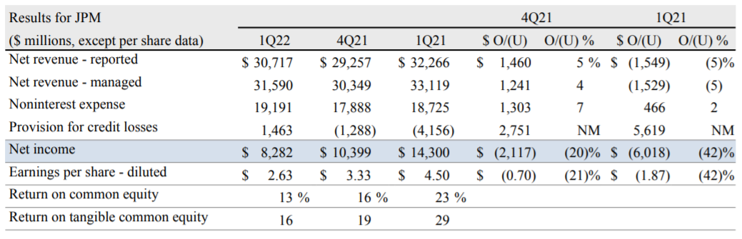 4月13日,摩根大通发布2022年第一季度业绩。财报显示,第一季度营收307亿美元,市场预期308.56亿美元,去年同期331.19亿美元;第一季度调整后营收315.9亿美元,市场预期314.4亿美元;第一季度净利润83亿美元,市场预期82.05亿美元,去年同期138.51亿美元;第一季度每股收益2.63美元,市场预期2.7美元,去年同期4.5美元。