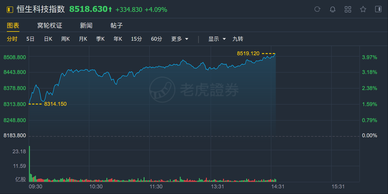4月1日,恒生科技指数一路上行,现涨4%,美团-W涨超8%,腾讯控股涨近5%。