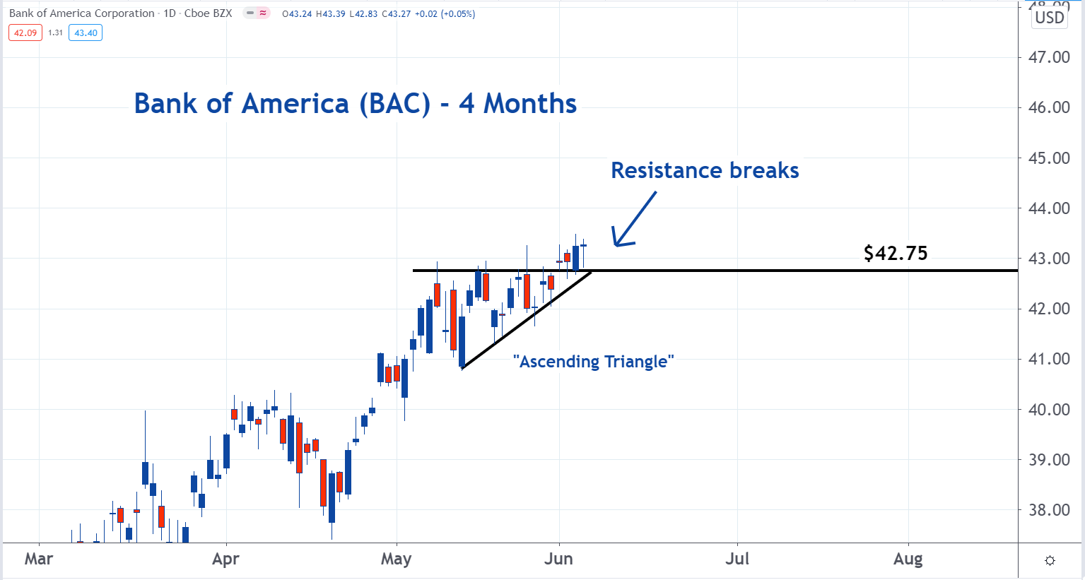 Bank of America's stock has broken the resistance at the $42.75 level and a new uptrend may be forming.