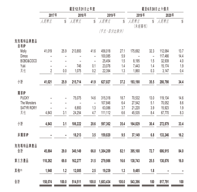 2017年至2019年,泡泡玛特的营收分别为1.58亿元、5.15亿元和16.83亿元,复合年增长率为226.3%;2020年上半年,泡泡玛特的营收为8.18亿元,较2019年同期的5.43亿元增长50.5%。