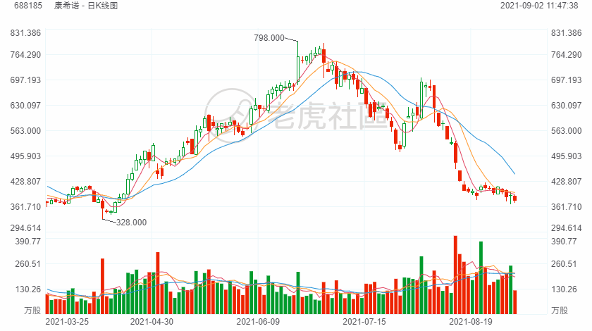 可之后的走势完全就是另一种“哇哦”了。自7月以来,康希诺股价一路狂泻,短暂反弹恐怕只是套住了更多看走眼的投资者。截至8月最后一个交易日,康希诺股价报收385.23元,较798元的高点腰斩,还多饶了一点儿,A股市值也不足1000亿。