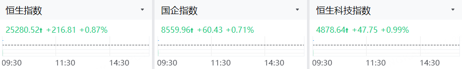 3月25日,港股三大指数高开,恒指涨0.87%,国指涨0.71%,恒生科技指数涨0.99%。