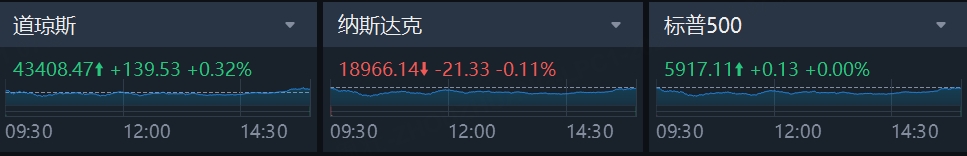 美东时间周三,三大指数涨跌不一,道指小幅上涨,标普500指数平收,纳指盘中一度跌超1%,最终小幅收跌。截至收盘,道琼斯指数涨0.32%,报43408.47点;标普500指数平收,报5917.11点;纳斯达克指数跌0.11%,报18966.14点。