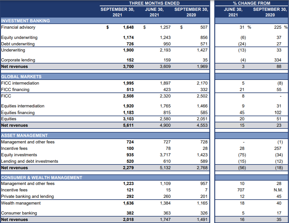 Results in the third quarter of 2021 evidenced continued strong overall performance with net revenues of $13.61 billion, 26% higher than the third quarter of 2020.