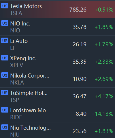 EV stocks rose in morning trading.Tesla,Nio,Xpeng Motors, Li Auto,Lordstown,TuSimple,Nikola and Niu Technologies climbed between 0.5% and 14%.