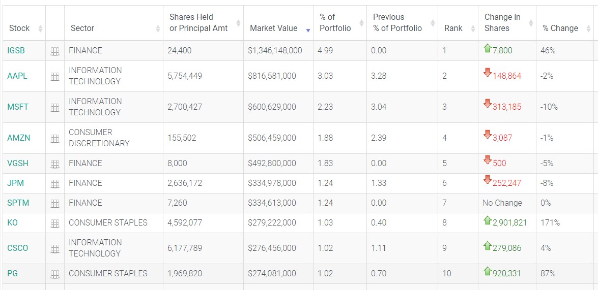 在前十大重仓股中,iShares短期公司债券ETF(IGSB.US)为第一重仓标的,持仓市值13.46亿美元,较上季度持仓数量增加46%,占投资组合比例为4.99%。