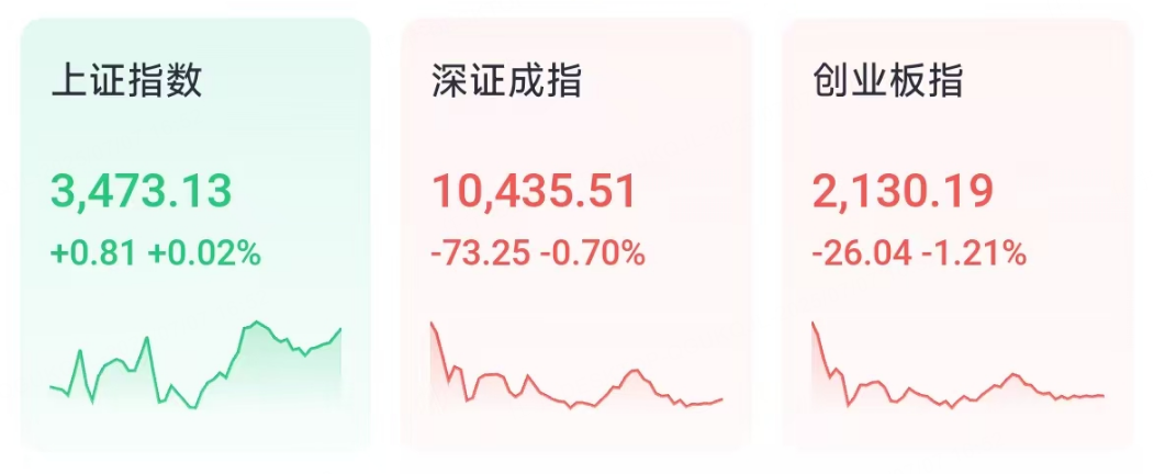 今日A股市场走势分化,沪指尾盘顽强翻红,创业板指调整明显,市场全天成交1.2万亿,较前一交易日缩量超2000亿,两市个股总体涨多跌少。截至收盘,沪指涨0.02%报3473.13点,成交4762亿元;深成指跌0.70%报10435.51点,成交7298亿元。创业板指下跌1.21%,报2130.19点。