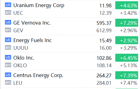 美股核电板块走强,Centrus Energy涨超7%,Oklo Inc涨超5%,Energy Fuels、GE Vernova、Uranium Energy跟涨。