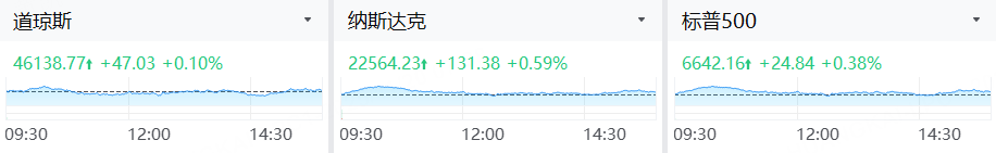 美东时间周三,美股三大指数集体收涨。截至收盘,道琼斯指数涨0.10%,报46,138.77点;标普500指数涨0.38%,报6,642.16点;纳斯达克指数涨0.59%,报22,564.23点。