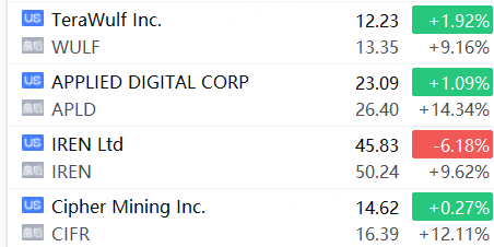 • 加密矿企概念股盘后全线大涨,APLD涨超14%,CIFR涨超12%,IREN、WULF涨超9%