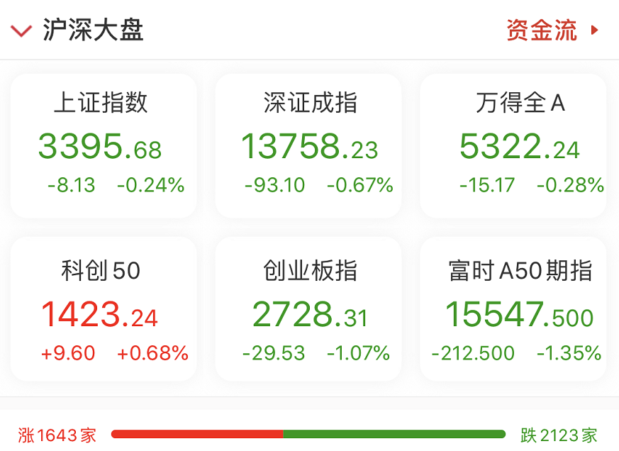 8月31日,A股再现跳水一幕。今天上午,市场延续上一个交易日强势表现,盘面走势也相对稳健。然而午后却风云突然,早盘一度净流入近36亿元的北上资金下午突然发动突袭,截至收盘,净卖出80亿元。上证指数再失3400点,收报3395.68点,跌0.24%;创业板指报2728.31点,跌1.07%;深证成指报13758.23点,跌0.67%;科创50报1423.24点,涨0.68%,唯成交超1万亿元。A50期指也于午后大幅跳水。