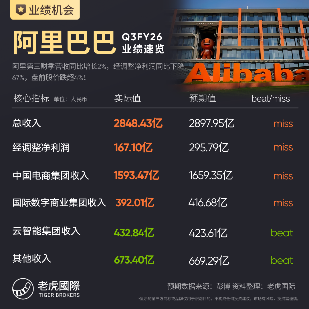 阿里巴巴 第三财季营收2848.4亿元人民币,若不考虑银泰和高鑫零售的已处置业务收入,同比增长9%,预估2897.9亿元。