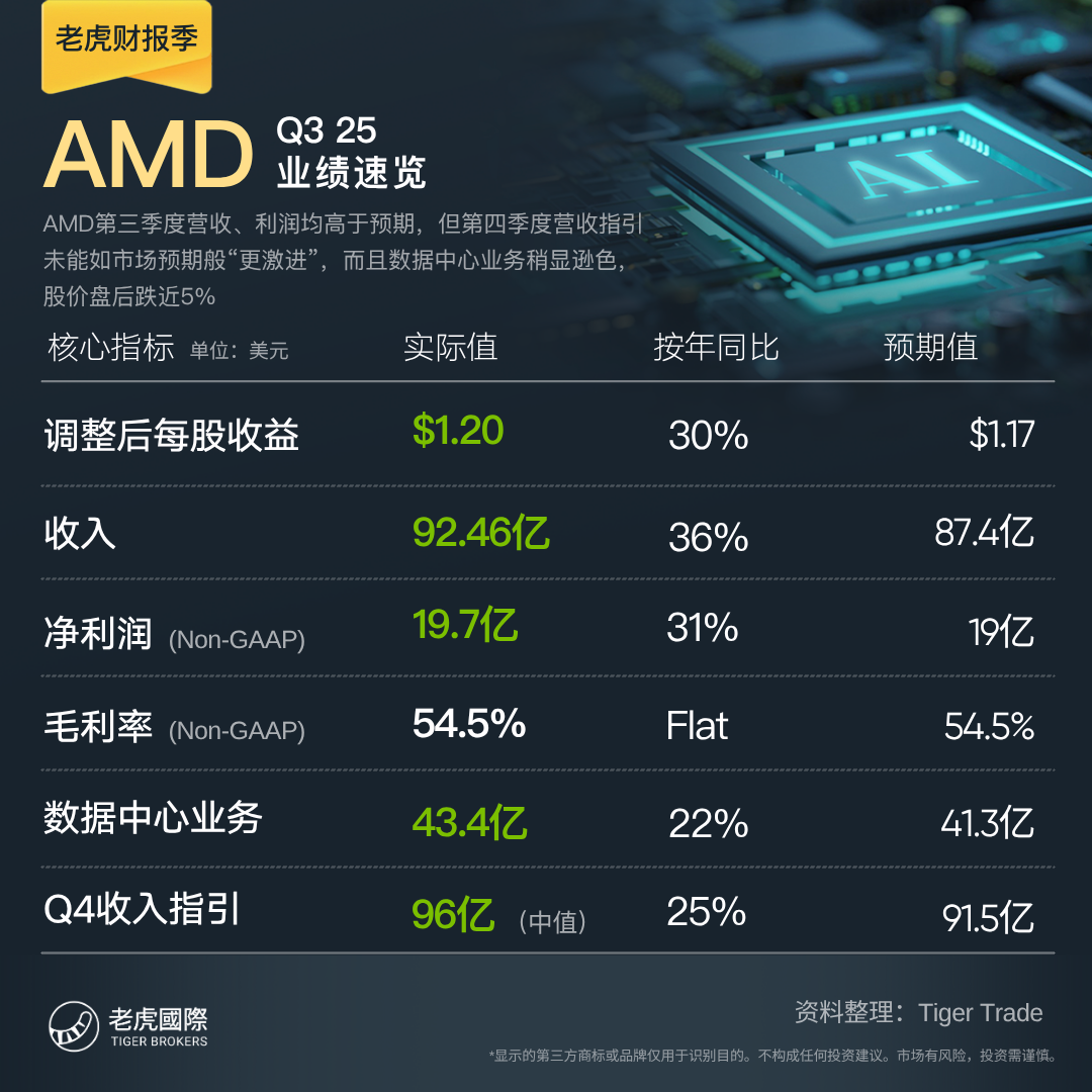 每股收益:AMD第三季度每股收益为0.75美元,去年同期为0.47美元。非GAAP口径下每股收益为1.20美元,去年同期为0.92美元,同比增长30%,高于分析师预期的1.17美元。