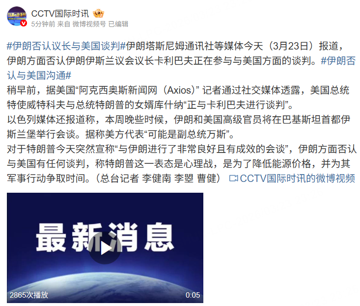 对于特朗普今天突然宣称“与伊朗进行了非常良好且有成效的会谈”,伊朗方面否认与美国有任何谈判,称特朗普这一表态是心理战,是为了降低能源价格,并为其军事行动争取时间。(总台记者 李健南 李曌 曹健)