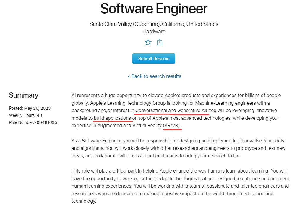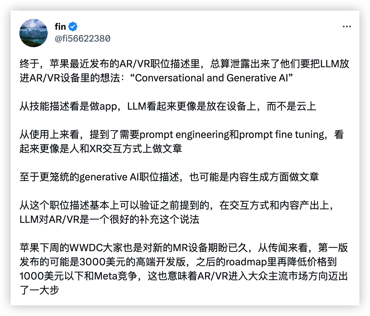 此前,科技博主fin发推称,苹果新的招聘公告显示其正在招募生成式AI领域的工程师,显示苹果也许计划将大语言模型与MR设备结合。