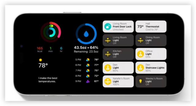 此外,在iOS17中,iPhone在横屏状态下可以变身为一个智能显示屏,可以显示日历事件、消息通知等内容。