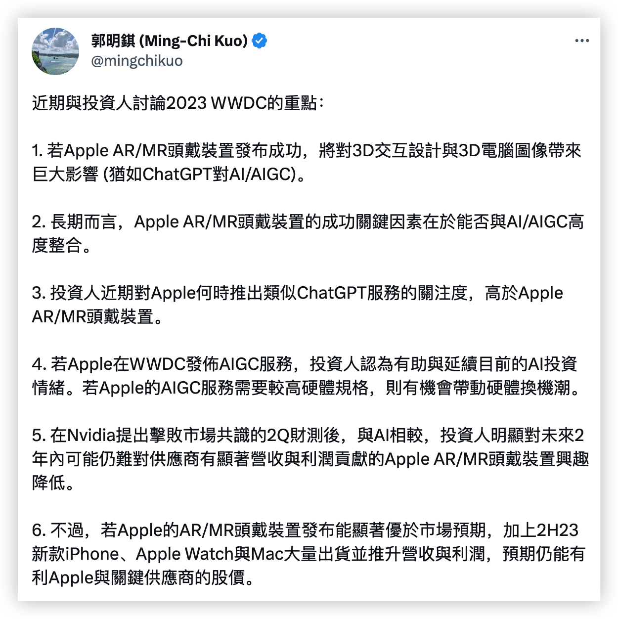 知名苹果爆料人郭明錤也发推称,今年的WWDC大会上,许多投资人都在关注苹果在AI方面的布局。