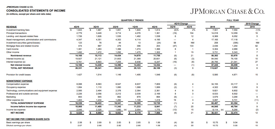 1月14日,$摩根大通(JPM)$ 公布2019年第四季度及全年财报,报告显示,摩根大通Q4净利润为85.2亿美元,同比增长21%。全年净利润为364.3亿美元,同比增长12%。
