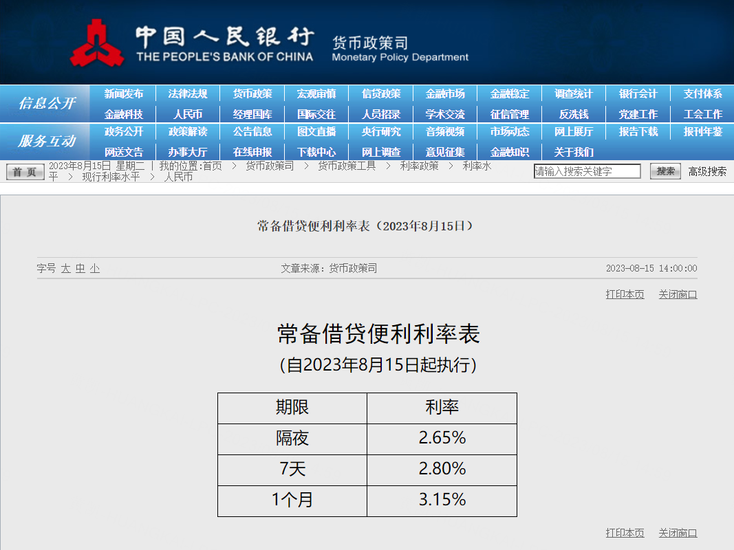 8月15日,中国央行调整常备借贷便利利率,隔夜期下调10个基点至2.65%,7天期下调10个基点至2.80%,1个月期下调10个基点至3.15%。
