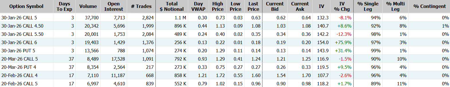 期权方面,Richtech Robotics当日成交28.26万张,较90日均量放大逾5倍,看涨期权占比79.3%,其中于1月30日到期的5美元行使价的看涨期权成交居前,成交近3.8万张。