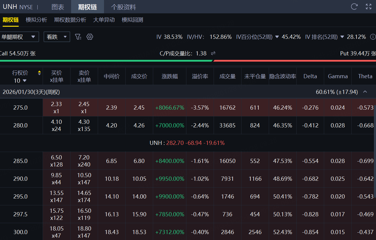 期权方面,联合健康当日成交93.94万张,较90日均量放大逾6倍,看涨期权占比58%,其中于1月30日到期的280美元行使价的看跌期权成交居前,成交逾3万张;此外,从期权链上看,联合健康多张Put单翻倍大涨,最高飙涨9950%。