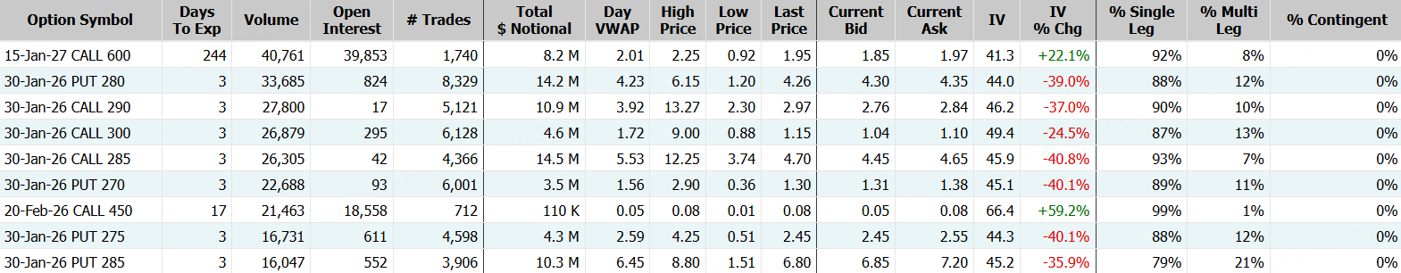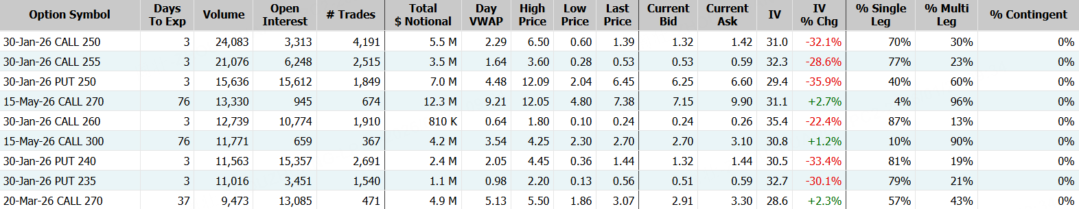 期权方面,波音当日成交41.39万张,较90日均量放大逾3倍,看涨期权占比66.4%,其中于1月30日到期的250美元行使价的看涨期权成交居前,成交逾2.4万张。