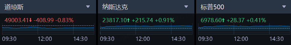 周二,美股三大指数涨跌不一。受科技股和芯片股提振,标普500指数收于新高;联合健康股价大跌,拖累道指收低。截至收盘,标普500指数涨0.41%,报6978.60点,刷新了1月12日创下的收盘纪录;纳斯达克综合指数涨0.91%,报23817.10点;道琼斯指数跌0.83%,报49003.41点。