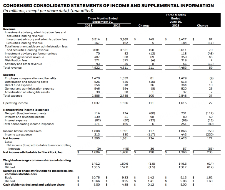 10月13日,贝莱德发布2023年第三季度业绩。财报显示,第三季度营收45.22亿美元,市场预期45.44亿美元,去年同期43.11亿美元;净利润16.04亿美元,市场预期12.56亿美元,去年同期14.06亿美元;每股收益10.66美元,市场预期8.26美元,去年同期9.25美元。