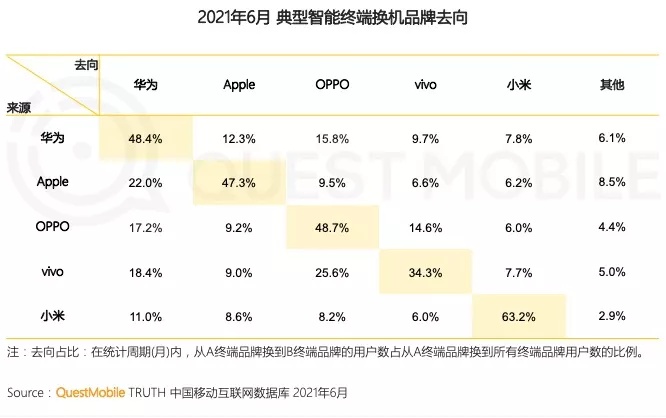 在供应链短缺、全球普遍缺货的情况下,小米能够保持自身的盈利情况,除了小米自身产业链完整,供应能力稳定外,与小米用户的忠实度有着分不开的关系。根据数据分析机构QuestMobile发布的《2021中国智能终端半年洞察报告》显示,换机品牌去向中,前五大手机品牌为华为、Apple、OPPO、vivo和小米,其中小米用户忠诚度居首,达到了63.2%,与第二名拉开了14.5%的差距。