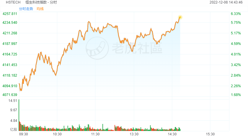 12月8日,恒生科技指数午后持续走高,涨幅扩大至6%,哔哩哔哩-W涨20%,阿里健康涨14%。