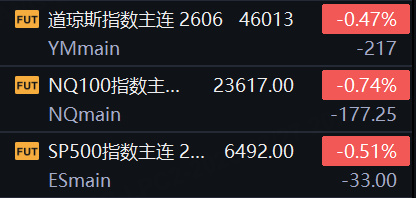 3月27日,美股三大期指普遍承压,反映风险偏好回落。道琼斯指数期货最新报46013点,跌0.47%;标普500指数期货报6492点,跌0.51%;纳斯达克100指数期货报23617点,跌0.74%,投资者在月末及地缘政治不确定性下保持谨慎。