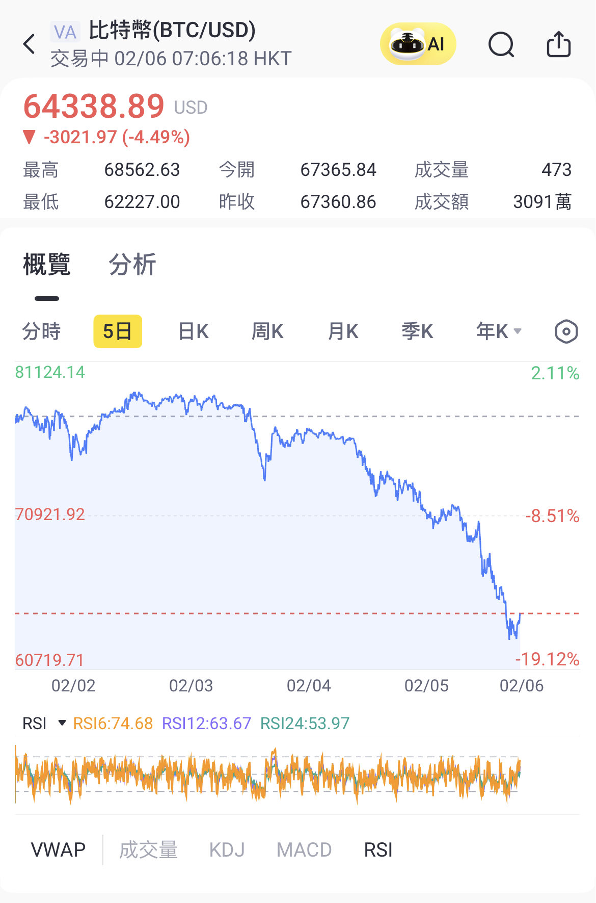 周五早晨,比特币加速下挫至6.4万美元附近。自去年10月触及峰值以来,比特币已累计下跌超过48%,目前徘徊在2024年10月价格水平附近。总市值也同步大幅缩水,从峰值2.48万亿美元跌至1.27万亿美元。