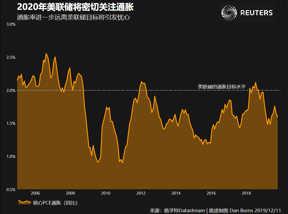 自2012年以来美联储将通胀目标设定为2%。虽然美国经济从上一次衰退中持续复苏,但通胀率一直未曾达到这个目标。2018年大部分时间内,通胀率其实是位于2%左右的甜蜜点,今年才滑落到2%以下。这对美联储是个问题,因为人们心中越是固守低通胀预期,物价上涨就可能变得更为缓慢。物价上涨缓慢听起来像是好事,但一旦通胀率像日本或欧洲那样跌到零水准甚至更低,那么支出和增长将受到压抑,因为消费者预期物价可能更低而暂不采买。所以,如果通胀率持续远离2%目标,美联储或将认为有必要再次降息以刺激通胀。