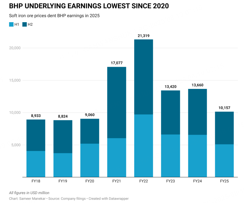 在本财年的大部分时间里,来自澳大利亚、巴西和南非的额外供应,加之中国钢铁产量下降,给铁矿石价格带来压力,影响了包括必和必拓和力拓 (RIO.AX), (RIO.L) 在内的顶级矿商的收益。
