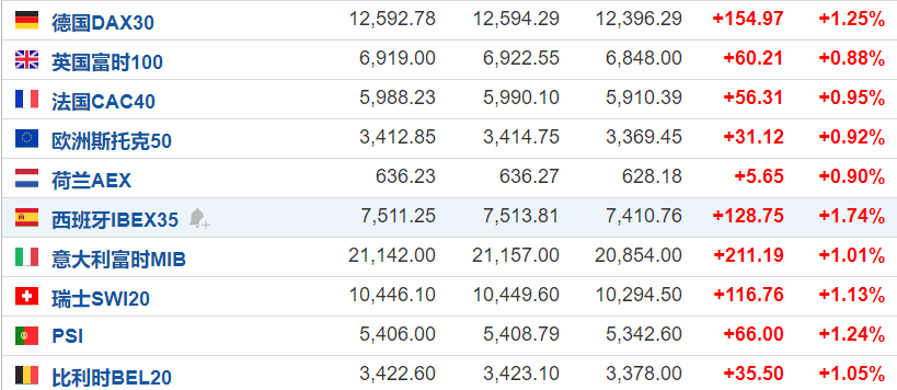 欧洲主要股指集体上涨,截至发稿,德国DAX30指数涨1.25%,法国CAC40涨0.95%。原油