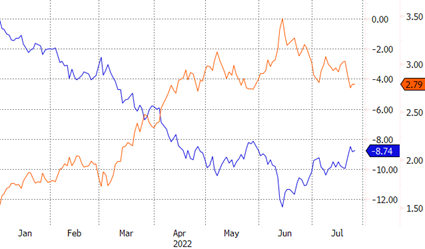 AGG YTD回报率(蓝色)与 10年期国债收益率(橙色)
