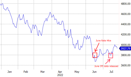 美联储在 6月 15日加息后, SPDRS&P 500 ETF Trust (SPY)上涨 1.4%,但随后第二天下跌 3.3%,后一天下跌 0.2%。截至今日,这是标准普尔 500指数在熊市期间迄今为止的最低收盘价。